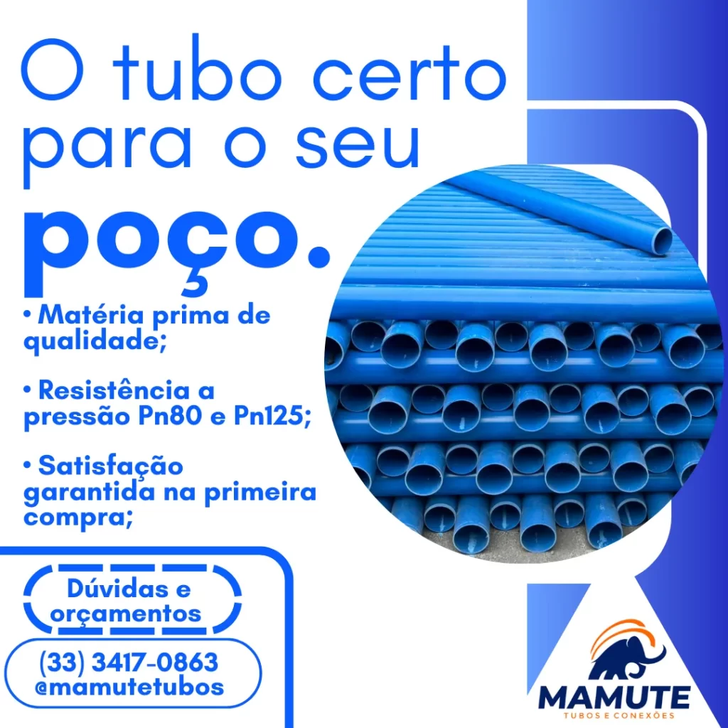 Na Mamute Tubos, somos especialistas na fabricação de tubos de PVC de alta resistência, desenvolvidos especialmente para atender às exigências dos sistemas de perfuração de poços artesianos e redes de irrigação agrícola.